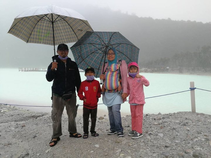 Perjalanan kami pada hari kedua dimulai dengan lawatan ke Kawah Putih. Malangnya pada hari itu, cuaca mendung dan hujan renyai-renyai semasa awal perjalanan hingga ke puncak gunung. Perjalanan mengambil masa lebih kurang hampir 2 jam. Setibanya kami di Kawah Putih, hujan turun dengan lebat. Kami rasa sedikit kecewa kerana tidak dapat bergambar dengan sepuas-puasnya di situ disebabkan angin yang kuat, hujan dan cuaca sangat sejuk. Selepas mengambil beberapa keping gambar, kami bergegas masuk ke dalam van semula.