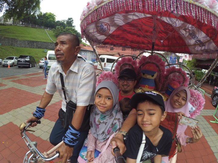 Tempat lawatan di bandar Melaka hanya walking distance sahaja. Sambil berjalan-jalan, kami melihat bangunan-bangunan di sekitar kota A Famosa dan Stadthuys sambil menceritakan sejarah Melaka serba sedikit kepada anak-anak. Ketika kami baru memulakan langkah, kami didatangi seorang pakcik penunggang beca yang menawarkan perkhidmatan tour di sekitar kawasan bersejarah itu dengan menaiki beca. RM25 untuk memberi anak-anak pengalaman menaiki beca. Anak-anak pastinya teruja.