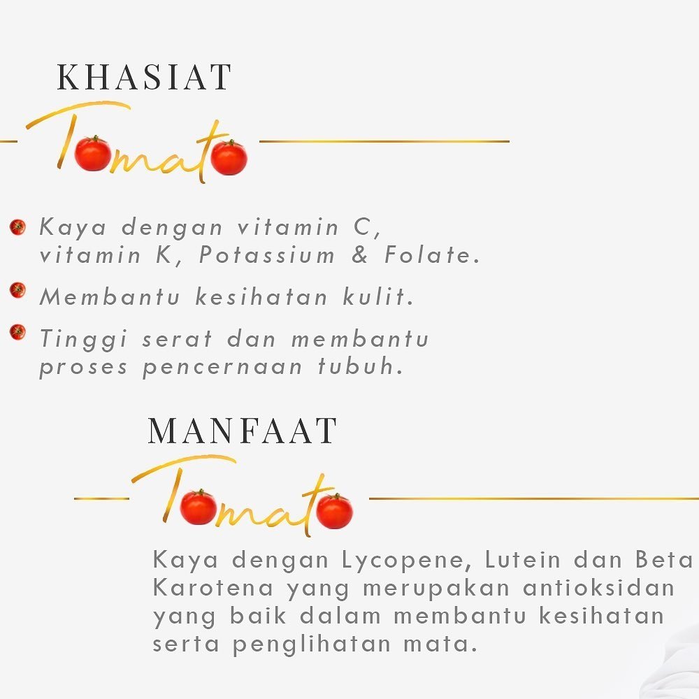 Banyak kan khasiat tomato? Aku paling suka tentang fungsinya sebagai antioksidan dan juga menjaga kesihatan kulit. Khasiatnya setaraf dengan supplement yang terkenal dan mahal seperti Crystal Tomato tetapi harga T’neeq lebih mampu milik.