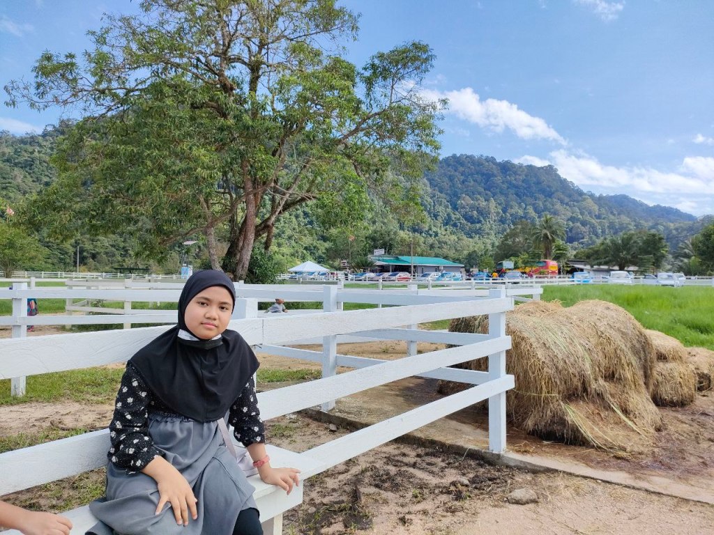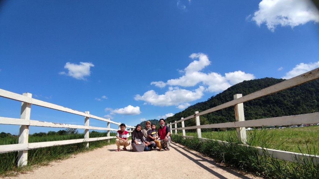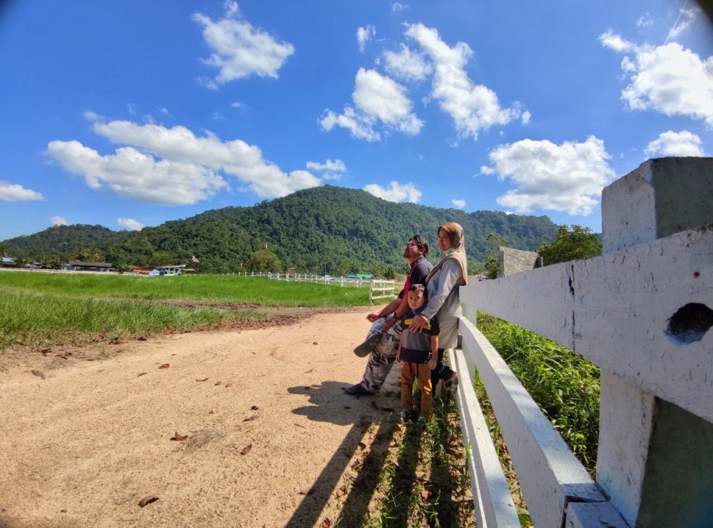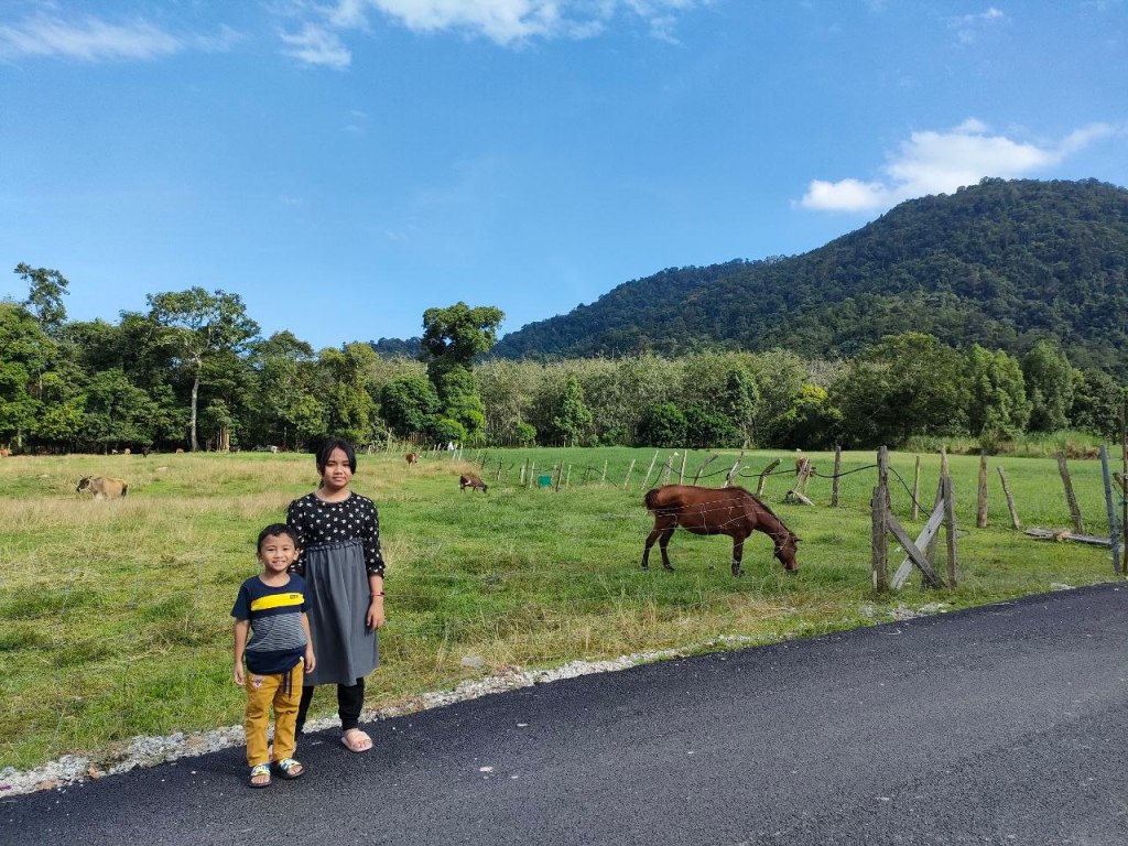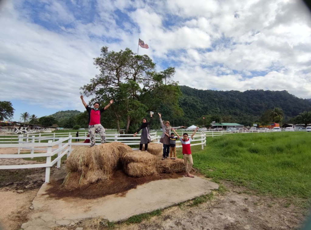 Sampai sahaja di Jeram Mengaji, kita disambut dengan pemandangan bukit nan hijau dan padang yang terbentang luas, tempat lembu-lembu dan kuda-kuda di sini makan rumput. Pengunjung pun masih tak ramai memandangkan waktu baru masih jam 2 petang. Walaupun cuaca panas, kita semua tetap enjoy bergambar. Biar gambar berbicara…