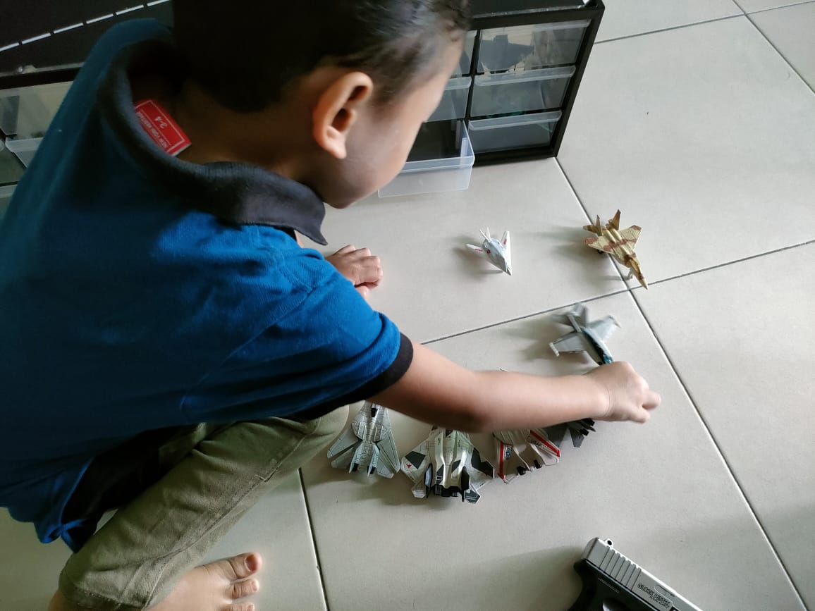 Ok balik pada topic kita. Abah memang dari dulu sangat meminati dunia ketenteraan dan fighter jet. So bila nampak Haikal tunjuk minat pada jet, abah seronok sangat dapat share hobi yang sama dengan anak-anak. Satu demi satu model jet abah dan mama beli untuk Haikal sampai la boleh buat koleksi dan hangar jet!!